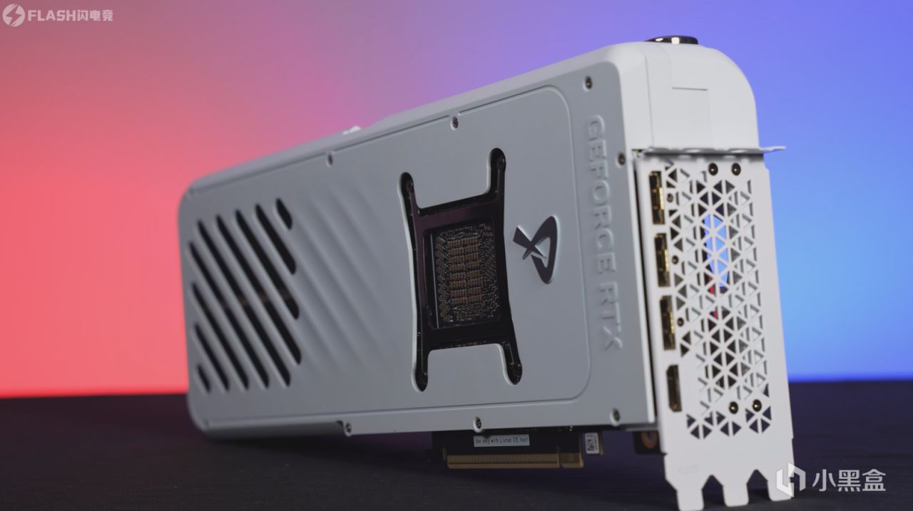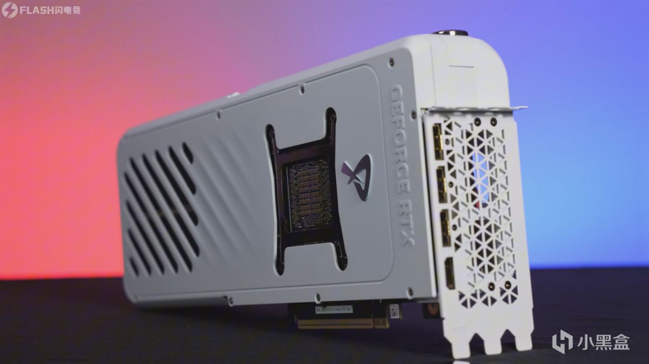 再看IO面板一侧,给到了三槽厚度的白色挡板,提供了足够的支撑性,放在桌面比较稳妥,毕竟以后肯定有很多人买5090D的赛博手办,三槽的挡板还是要方便不少的。