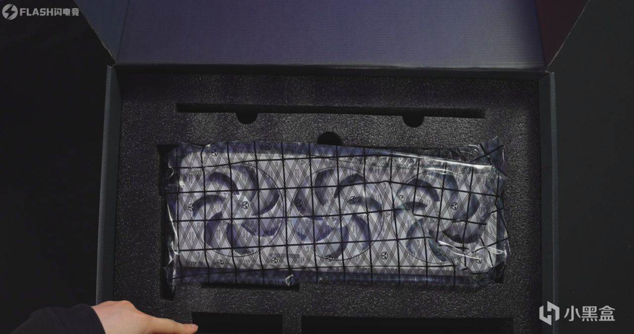 盒子里面只有一张显卡,珍珠棉还是挺厚实的,说明书之类的,应该是放在这个凹槽里面的,主体顶部这边看起来应该是送了一个显卡支架,下面两个空位,右侧这个应该是8pin转16pin的转接线,左侧应该是与主板同步的灯控连接线。