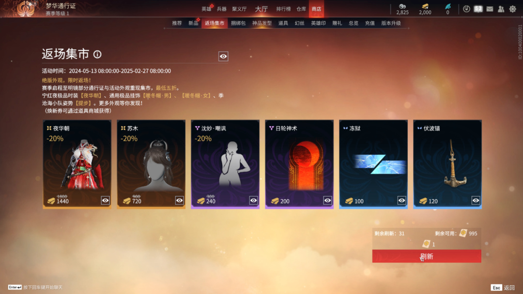 参与返场集市活动,有机会最低五折获取赛季启程至淬炼赛季通行证、限时活动内的超多绝版外观!
