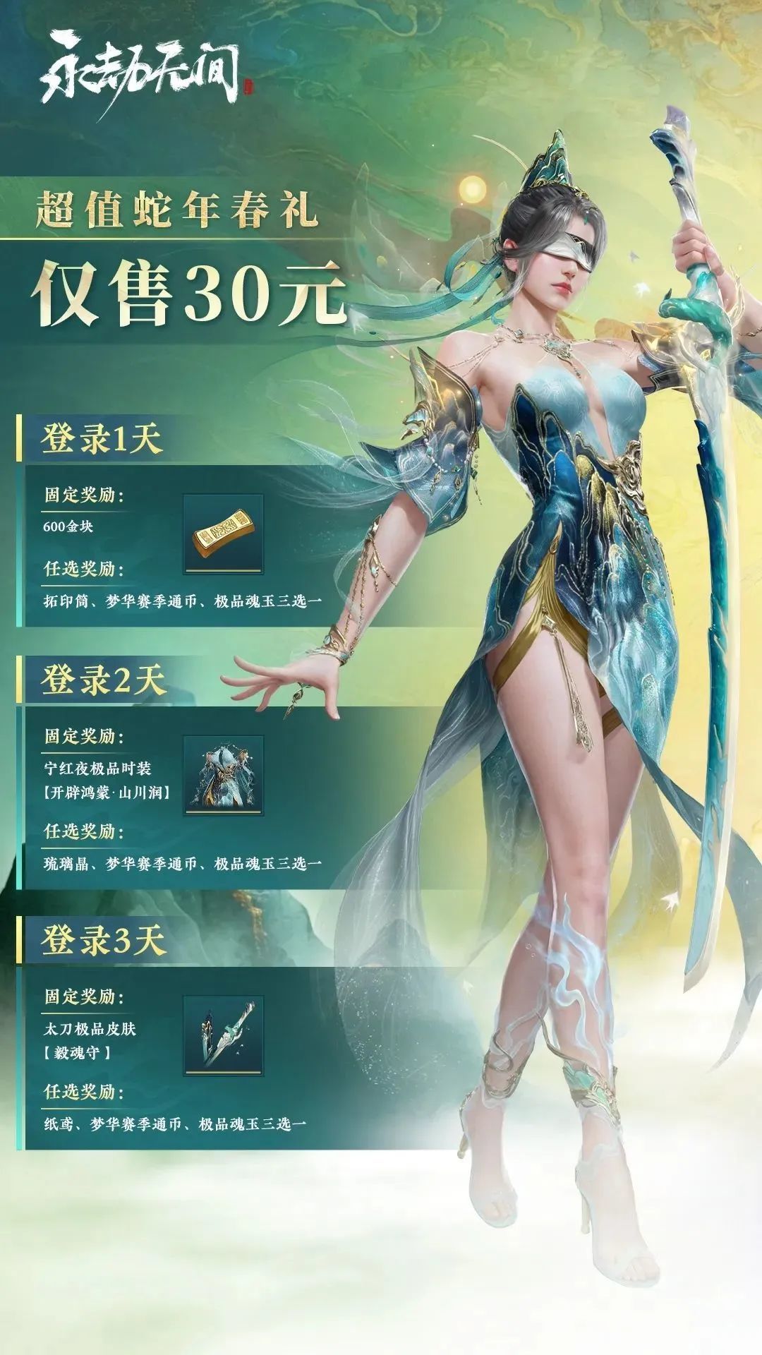 仅售三十元的蛇年春礼,购买后可获赠600金块,登录三天,即可获得宁红夜极品时装【开辟鸿蒙·山川润】、太刀极品皮肤【毅魂守】,更有琉璃晶、梦华通币、极品魂玉等额外奖励自选获取!