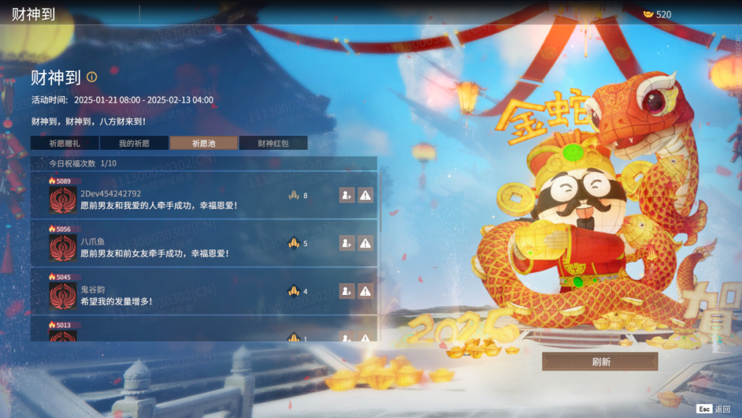 活动期间,前往蓬莱岛财神爷处向财神爷留言祈愿,或查看、点赞其他玩家的愿望,可完成任务获得【财神元宝】