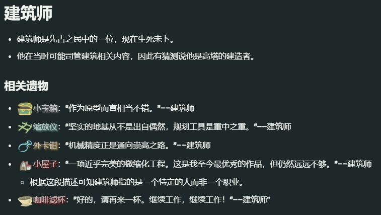 【先古之民】還能夠把【魔法】運用到建造中。“縮放儀”“小寶箱”“小屋子”,三者存在關聯,我推測“建造師”先運用“縮放儀”(假設它的效果真的爲字面意思)這樣的魔法工業道具將【高塔】內常見的寶箱進行縮放,作爲實驗,成功後再嘗試縮放屋子(所以“小屋子”是BOSS級別的遺物,而小寶箱只是“普通遺物”)。證據爲“小寶箱”的說明,即“作爲原型而言相當不錯。——建築師”,所指的就是作爲“縮小”的較早實驗品。