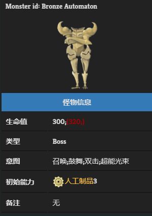 銅製機械人偶,具有超能射線這樣的強大技能,外型的設計具有較高的技術含量,還有銅球作爲守衛。自帶【人工製品】BUFF,符合其外形。它更加接近人工製品的設計。其外形也可能是【故障機器人】的設計參考,兩者的肢體採用類似的材料和設計。其“無頭”的外觀可能暗示其缺乏自我意識,而恰好【故障機器人】是唯一人形且具有自我意識的【人工製品】。