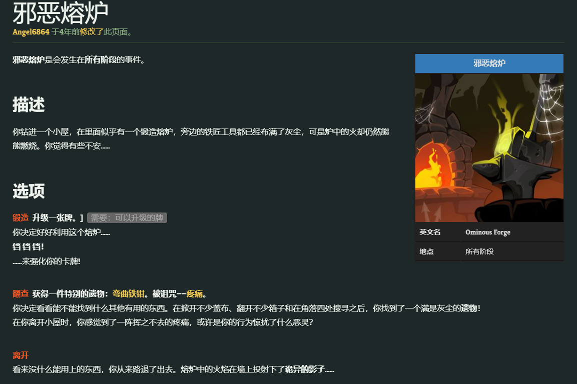 【先祖之民】的鍛造能力已經到達爐火純青的境界,代表事件有“邪惡熔爐”,熔爐的擁有者已經變成了“惡靈”一樣的存在,化爲火焰在爐子中不斷燃燒,取走它的遺物“彎曲鐵鉗”會獲得“疼痛”詛咒,這工具每回合都能強化一張手牌,也足以證明其強大的作用。如果只是使用熔爐升級卡牌則不會有懲罰,可見就算是“惡靈”,也准許你進行正常的鍛造。第二層“城市”的作戰背景中也有不少火熱的熔爐,但由於沒有正面的直接展示,我們暫且將其作爲假設。BOSS級別的遺物“融合之錘”,其表述是:“一旦握住,就永遠無法放下。”,顯然屬於不科學的【魔法】設定,其廢除“鍛造”功能的機制暗示其和鍛造有密切關係,錘子上面的粉色火焰很可能和【魔法】有關,但也不排除其造型參考了其他遊戲之外的設定的可能。