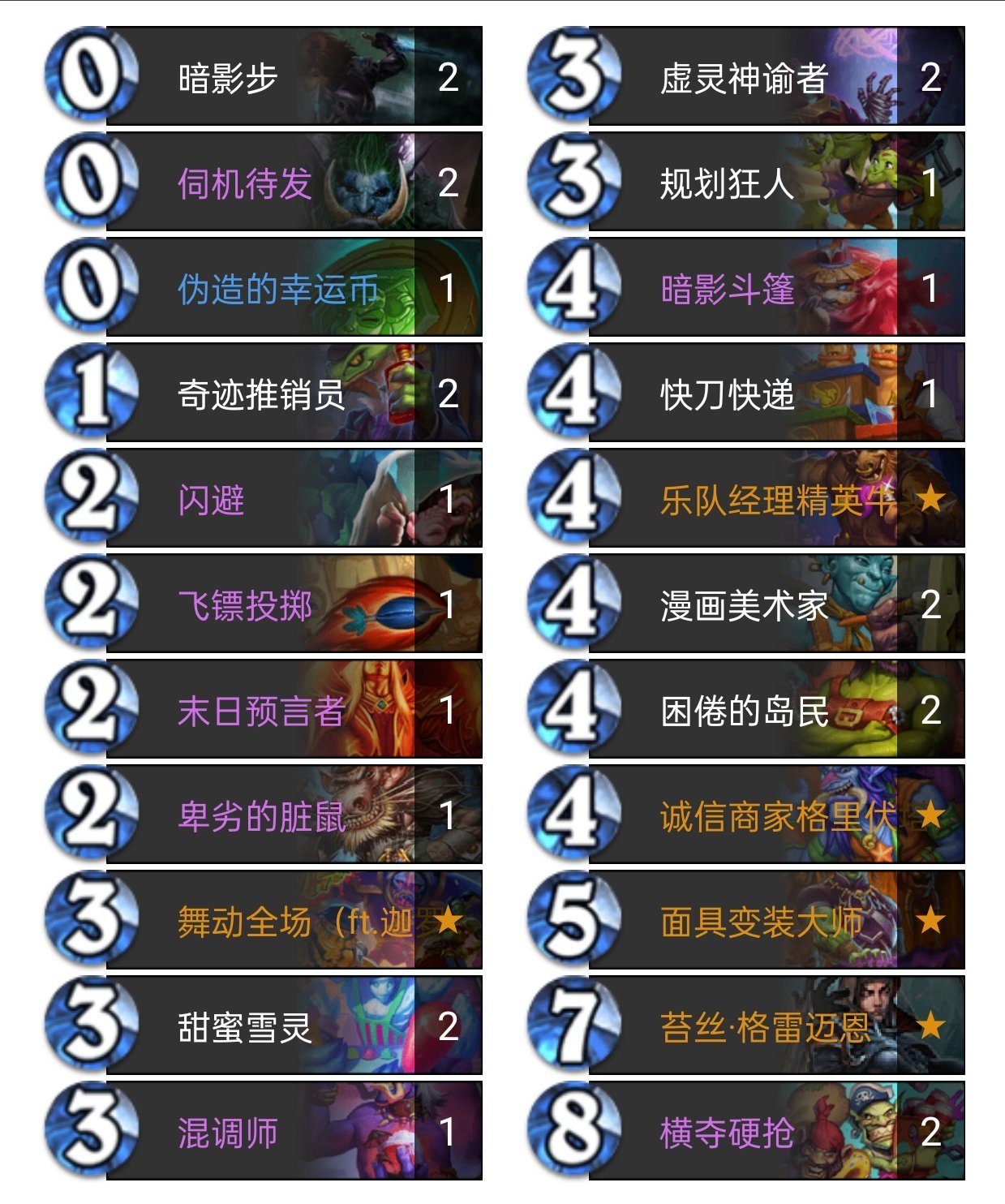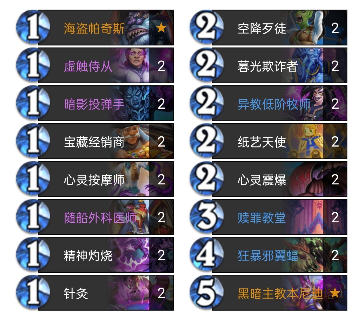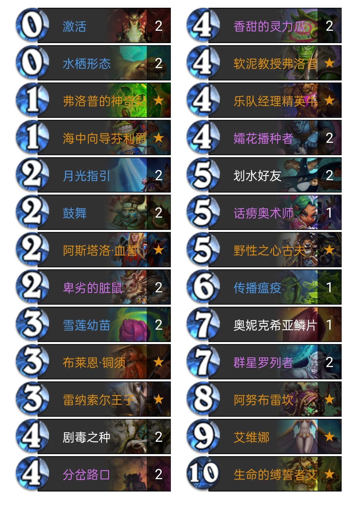 羣星羅列者這張卡的特效非常華麗,三個七血隨從就可以召喚星星特效,只可惜後面出的太多破壞OTK的牌,再加上卡組組件要求太高了,面對狂野🐴王環境根本玩不下去,但是經過查找終於找到了最新的77德,雖然時間可能相差蠻多的但是可以大家自行修改。