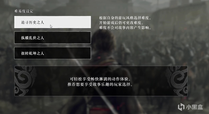 第一次游玩时,游戏只有三种难度可供选择,分别为追寻历史之人、纵横乱世之人、扭转乾坤之人。但当玩家首次通关以后,便可以解锁隐藏难度“勇战无双之人”,对于全成就玩家来说“勇战无双之人”难度的解锁至关重要,毕竟大量武器、战马都只能在该难度下完成挑战后解锁。