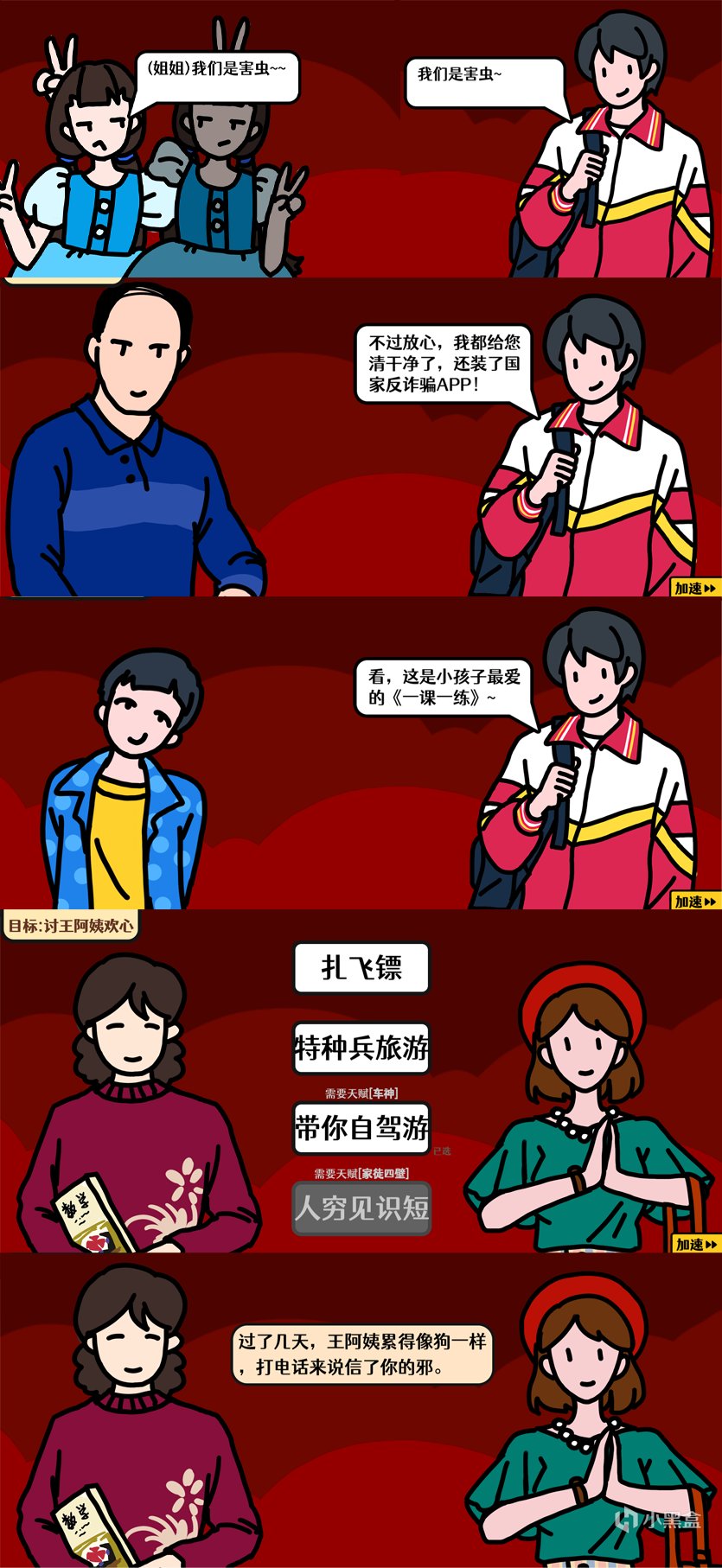 游戏除了养成还有不少精彩之处。多种小游戏元素融合,像抢红包、包饺子等,增加了趣味性和耐玩性。游戏中有四个主线角色可供选择,通过完成任务和玩小游戏获取红包,提升角色能力,解锁性格词条和对话选项。与亲戚交流时,不同的对话选择会影响亲戚的好感度和嚣张度,进而决定游戏走向,考验你的智慧和情商。