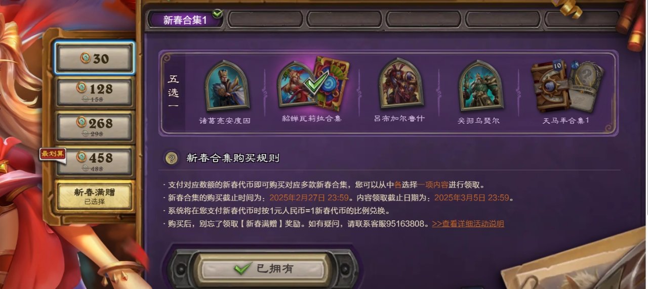 新春合集2售价158,可以在钻石英雄皮肤恶魔变形伊利丹、传说英雄皮肤月夜战神泰兰德和传说英雄皮肤传奇火车王和卡包合集中自选一个。