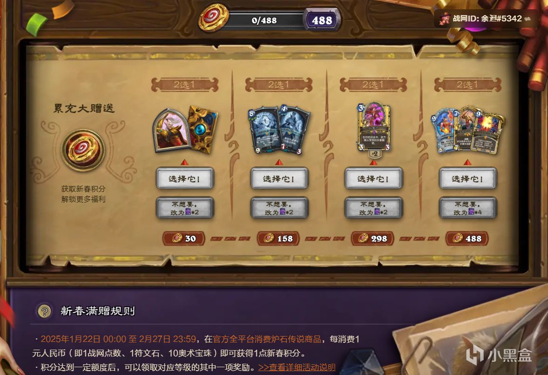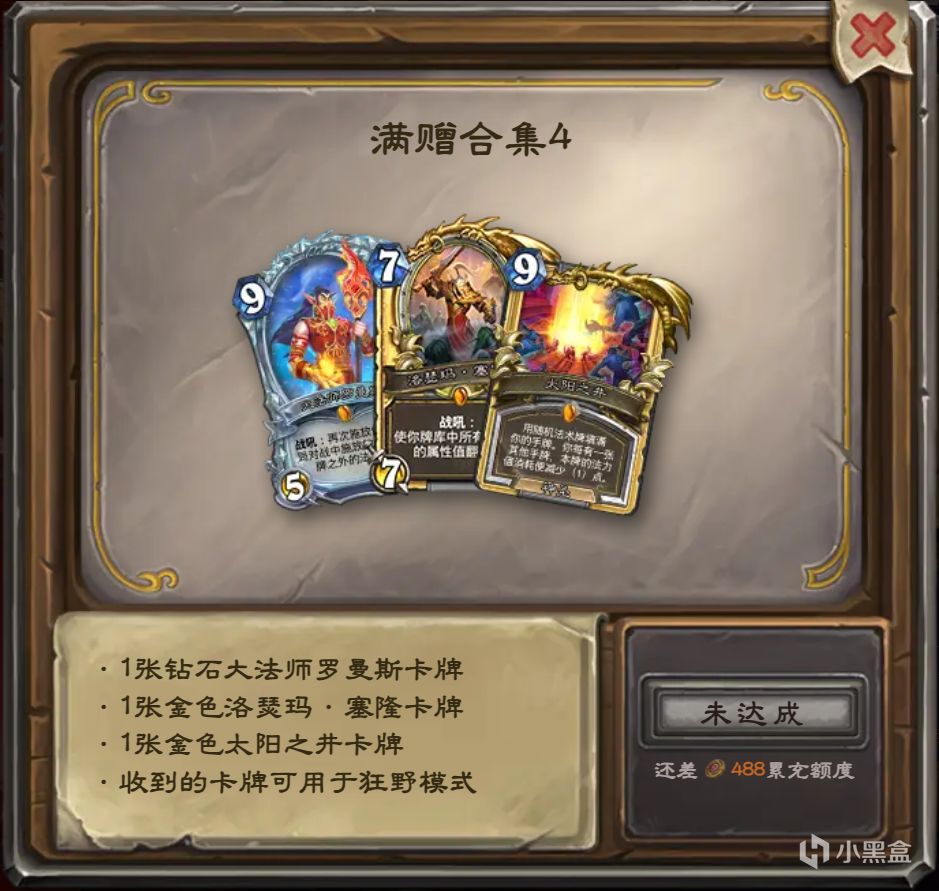 消费满488可以领取金色传说随从洛瑟玛塞隆+钻石传说随从大法术罗曼斯和金色太阳之井或2深暗领域卡包(二选一)