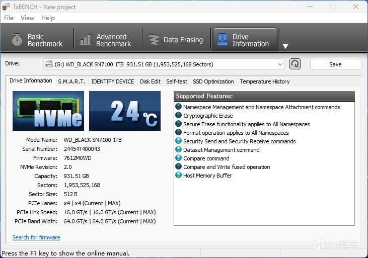 TXbench显示,SN7100运行在PCIeX4速率上,并支持NVMe2.0。
