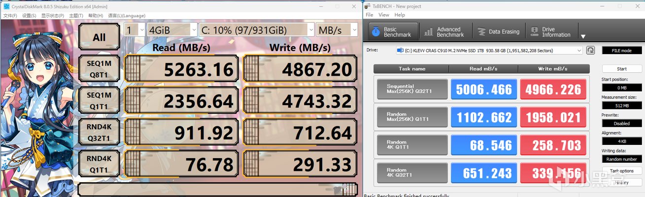 在CDM与TxBENCH测试中,能跑出顺序读取最高接近7100MB/S,读取接近7000MB/S的成绩,符合其旗舰定位的性能。