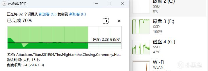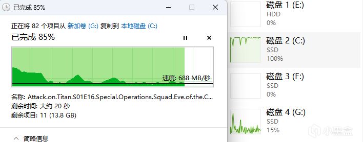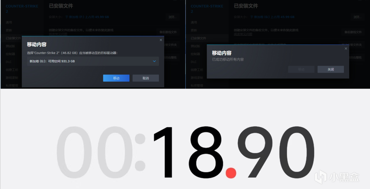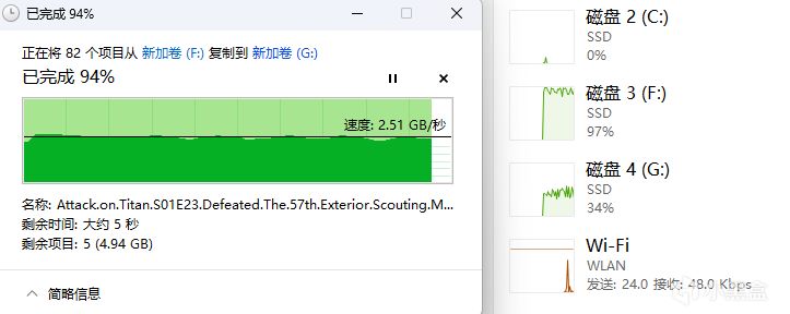 将CS2(46.82GB)从游戏盘转移到SN7100,用时18.9秒。