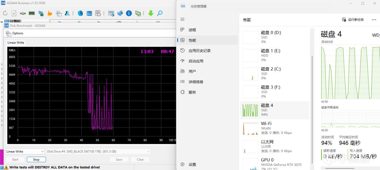由SN7100往中端PCIe4.0硬盘C910写入100GB大文件,不知为何C盘有些绷不住,占用100%,尚未发挥SN7100的实力。
