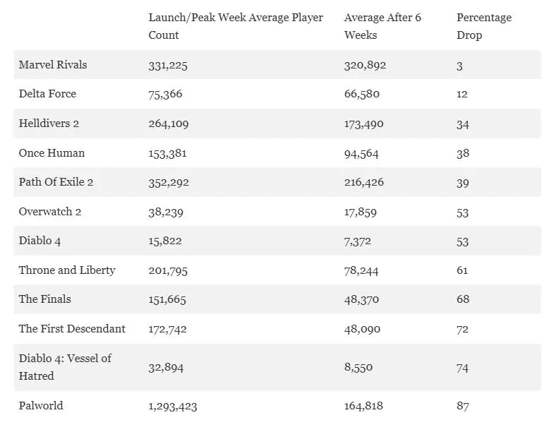 此外,以6周爲時間區間進行對比,《絕地潛兵2》、《流放之路2》和《幻獸帕魯》這些熱門遊戲的留存率也完全無法與《漫威爭鋒》相媲美。其中,《絕地潛兵2》流失了34%的玩家,《流放之路2》流失了39%的玩家,而《幻獸帕魯》更是流失了高達87%的玩家。值得注意的是,在《漫威爭鋒》發售前一天推出的《三角洲行動》雖然玩家流失率爲12%(首發75,366人,6周後66,580人),雖然不及《漫威爭鋒》堅挺,但也遠超其他遊戲作品。這進一步證明了《漫威爭鋒》在玩家留存率方面的卓越表現。