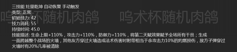3技能偏向輔助,爲功能性技能,技能開啓後擁有8198血量(等效11712),1502攻擊力,1275防禦力,165hps自回,單次灼燃損傷150,小怪精英7次爆條,Boss14次爆條。同類比圖圖2技能一樣,爆條速度取決於被配合的幹員的攻速,小提一嘴圖圖只能再拐1人,但餘隻要幹員和敵人在火牆的兩側就可以造成損傷,條件非常簡單,所以該技能配合荒拉澄閃還真能展現亂殺的場景了,哪怕是和維什戴爾組合都能做到聚怪+核彈的效果,至於清敵人子彈就當輔助功能,20%概率說起來有點低,偶爾觸發一次可以減小生存壓力,直接無腦專三就行!