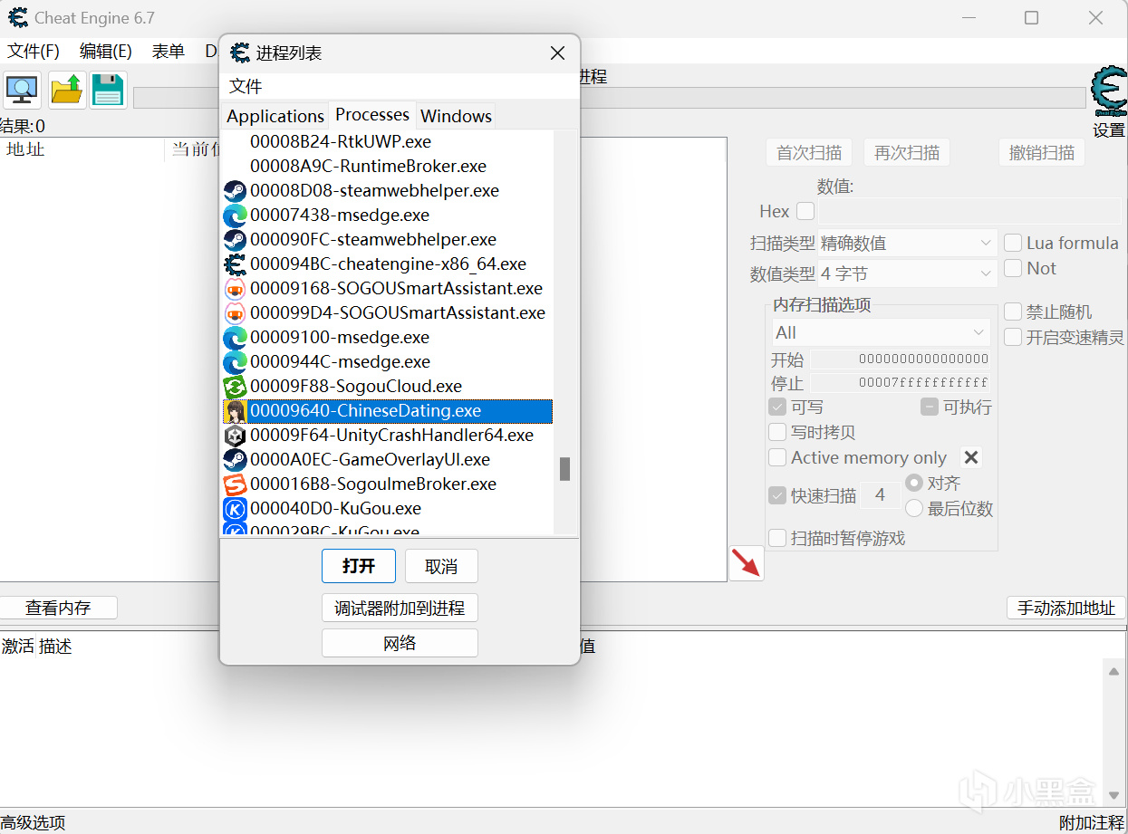 在进程列表中选中我们要修改的程序,点击“打开”。《中国式相亲》为图中的“chinesedating.exe”。