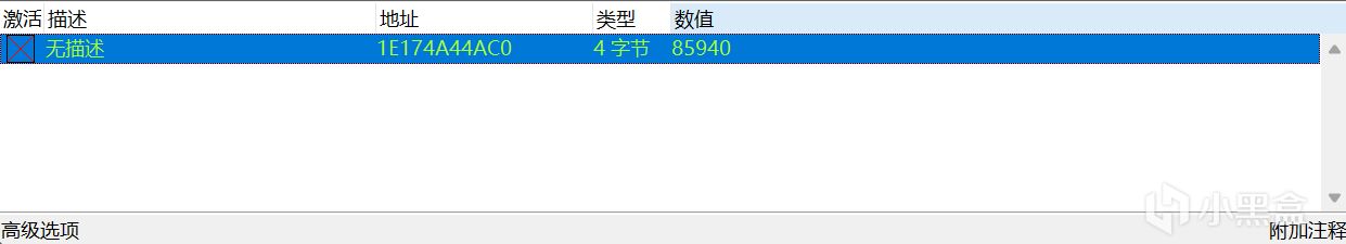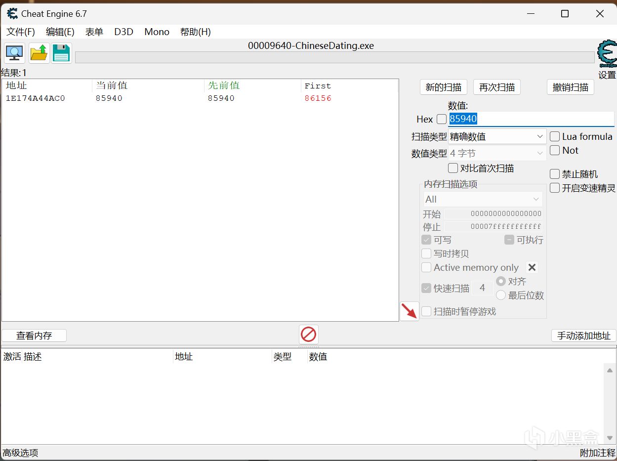 可以看到现在的金钱数为85940,我们将其填到数值栏中,点击“再次扫描”,可以看到现在只有一个地址了,那就是我们要的。
