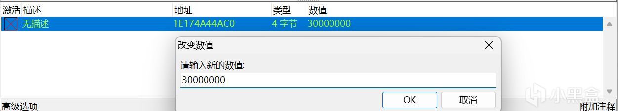 找到地址后我们点击它,它就会出现在程序下面的框中。我们选择“激活”并双击数值部分,会弹出一个“改变数值”的框。