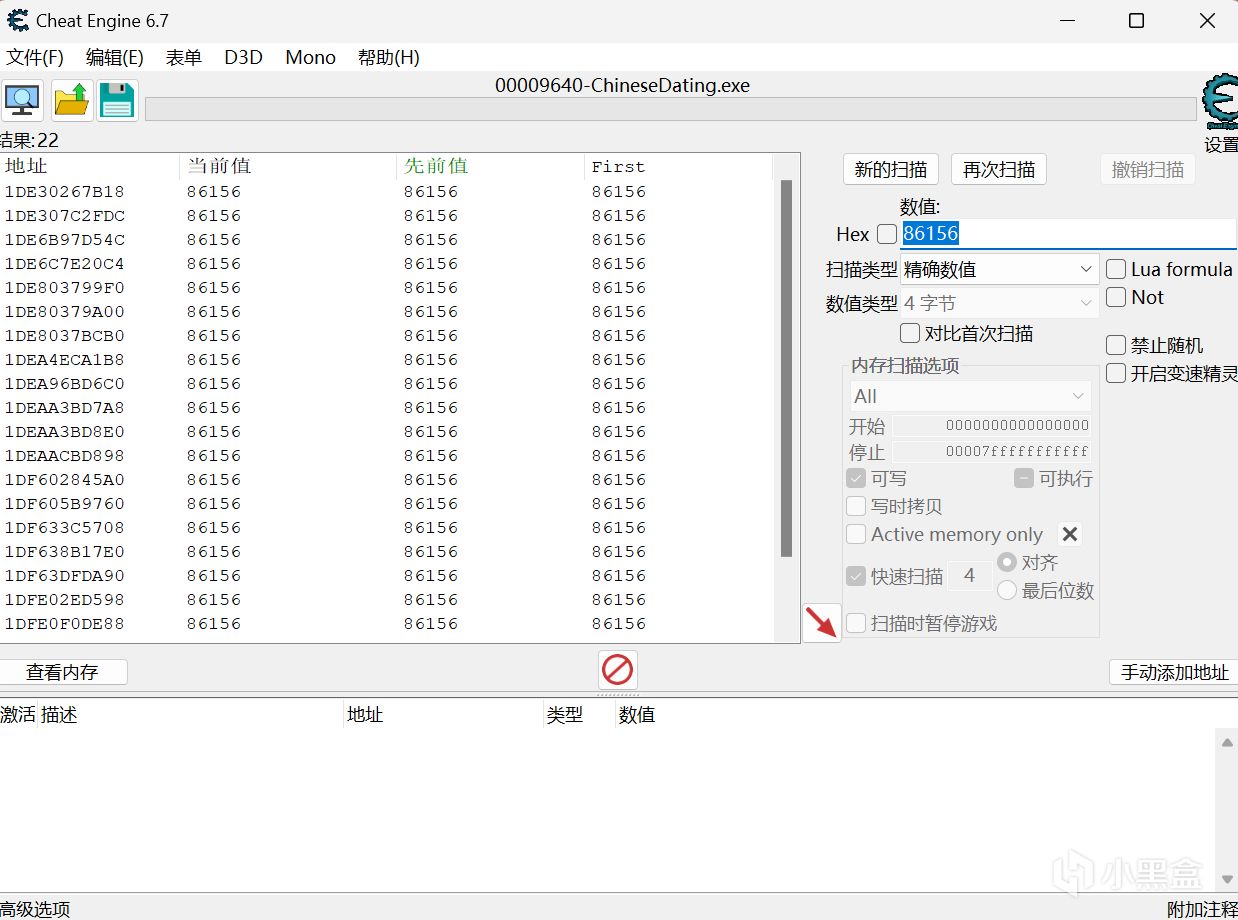 假如“再次扫描”后依然存在多个结果,可以再次使数值发生变动,然后输入新数值选择“再次扫描”,重复直到只剩一两个结果;