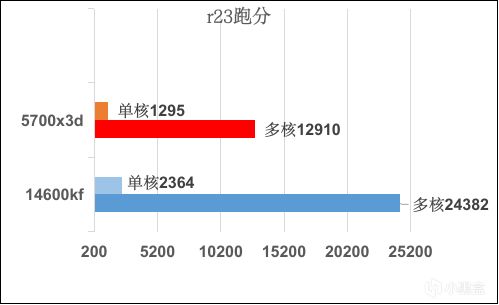 在cinebench r23中,14600kf多核得分24382分,單核分數爲2364分。5700x3d單核1295分多核12910分14600kf依舊是斷崖式的領先