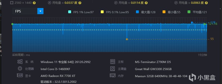 在原神跑圖測試中,我們選擇從蒙德到璃月三十分鐘跑圖與須彌10分鐘跑圖打怪測試,畫質預設手動拉至最高。在全程測試中均開啓錄屏,錄屏預設爲x264編碼,幀率穩定60。解鎖幀數到120幀後,設置畫質爲2k預設高畫質,平均幀數120幀,可以看到,全程幀數曲線穩定一條直線,只在讀條時會出現幀數不到120幀的情況。對於很多玩家而言,原神設定的最高60幀體驗並不是很好,解鎖幀數是很多玩家的選擇。在網絡上我們經常會看到有人反應原神超過60幀後優化極差,我們認爲這主要是cpu性能與內存性能不足導致的。Intel 14600kf cpu超強的單多核性能與內存超頻性能讓14600kf在120幀時也可以穩定滿幀率。