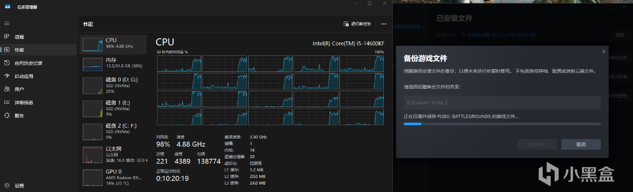 談起14代cpu不得不談的就是大小核調度。14600kf6大核8小核的設計讓在低負載時大小核的選擇十分重要。Intel 14代小核在avx等指令集下,性能不俗。但作爲小核,intel並沒有爲它搭配完整的avx2發射單元。這使得它比起爆發性的任務更適合更輕的負載。但這並不意味着小核性能不好。作爲加起來跑分接近4000分的怪獸,在一些簡單的生產力場景與遊戲負載中,發揮仍然不俗。在測試中,如果測試任務負載較高,即使位於後臺Windows仍然會選擇使用全部的核心運行負載。特別的,在steam進行遊戲備份壓縮時,如果使用我以前的12600kf,steam只會使用小核壓縮。而換爲14600kf後,則會選擇所有核心進行壓縮。