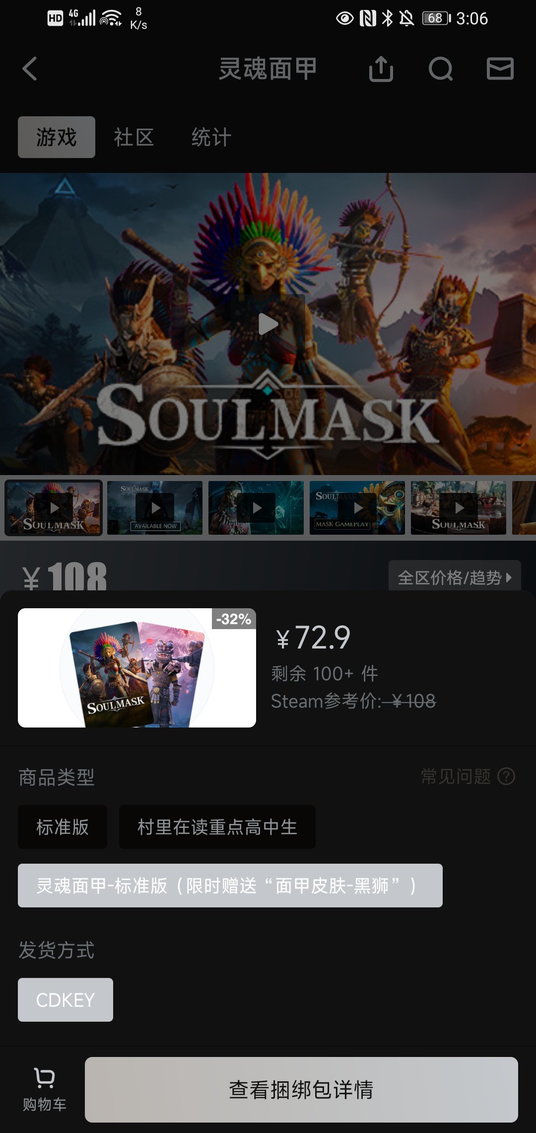 在新春促销期间,小黑盒买游戏就送限定舞狮面甲皮肤【促销期间上架捆绑包:标准版(限时赠送“面甲皮肤-黑狮”),价格与本体相同】,大家可以点击一下“查看捆绑包详情”