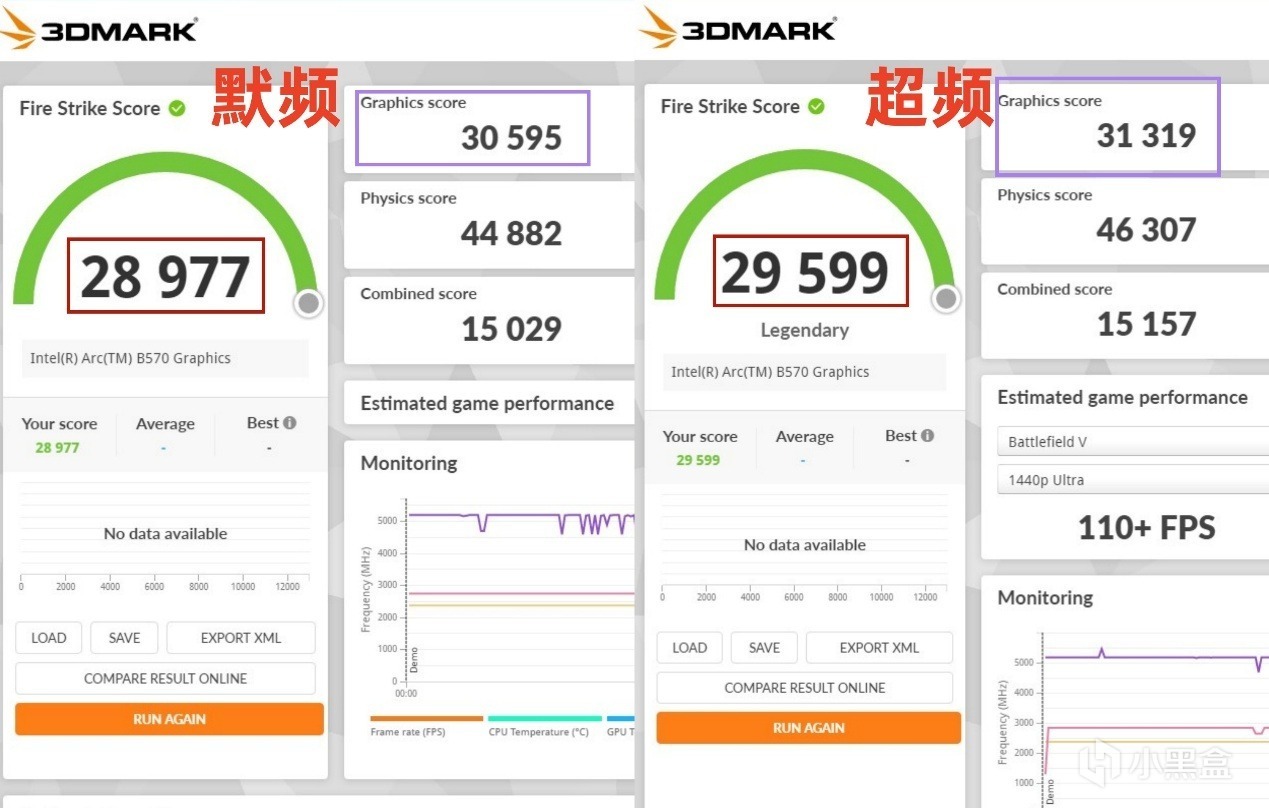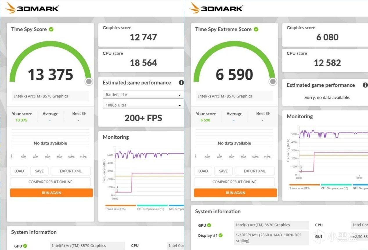 蓝戟B570 Photo 10GB在Time Spy下的得分为13375,其中显卡得分为12747;在Time Spy Extreme下的得分为6590,其中显卡得分为6080。