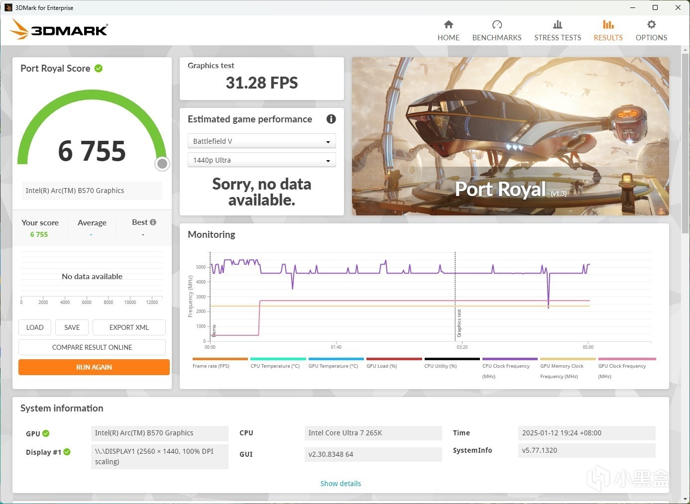 蓝戟B570 Photo 10GB在3DMark Port Royal下的得分为6755,对应显卡测试的平均帧率为31.28 fps。
