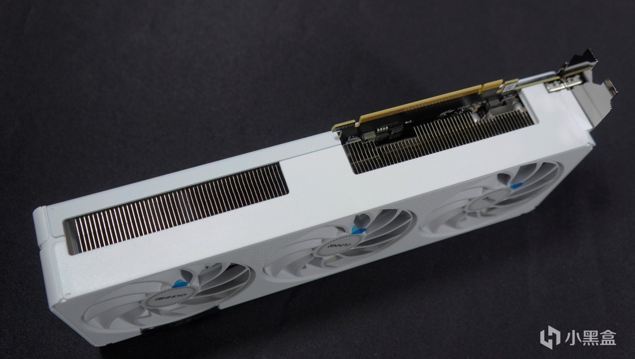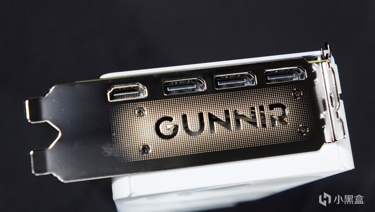 视频输出接口的部分仍旧是三个DP 2.1接口一个HDMI 2.1a接口,其中第二个DP接口规格为UHBR 13.5。显卡挡板沿用了特色的镂空Logo设计来提升散热,要说有变化的地方就是加入了立体点阵图案设计。