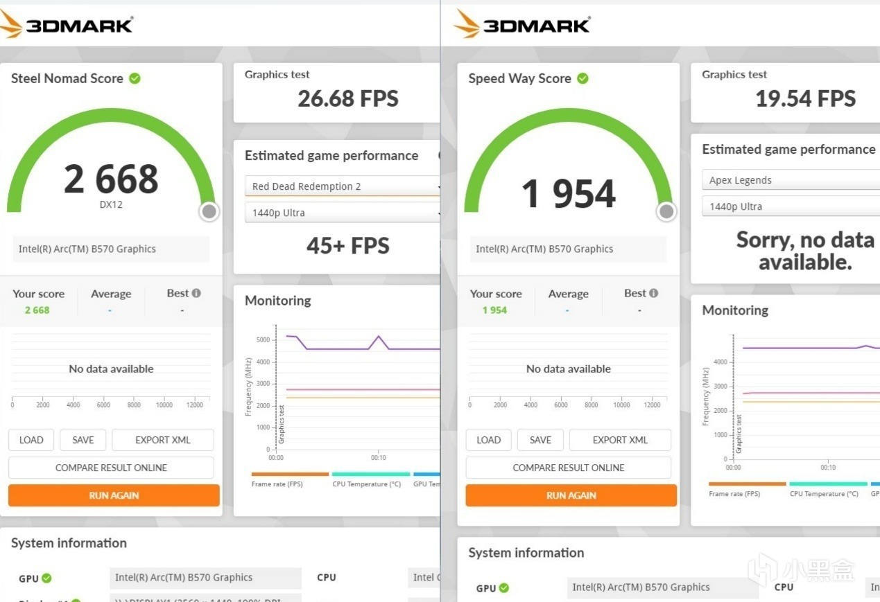 蓝戟B570 Photo 10GB在3DMark Steel Nomad下的得分为2668,平均帧率为26.68fps;在Speed Way下的得分为1954,对应显卡测试的平均帧率为19.54 fps。