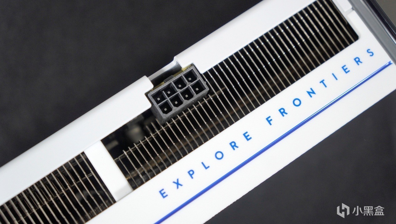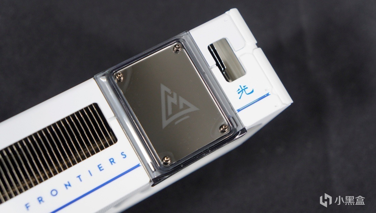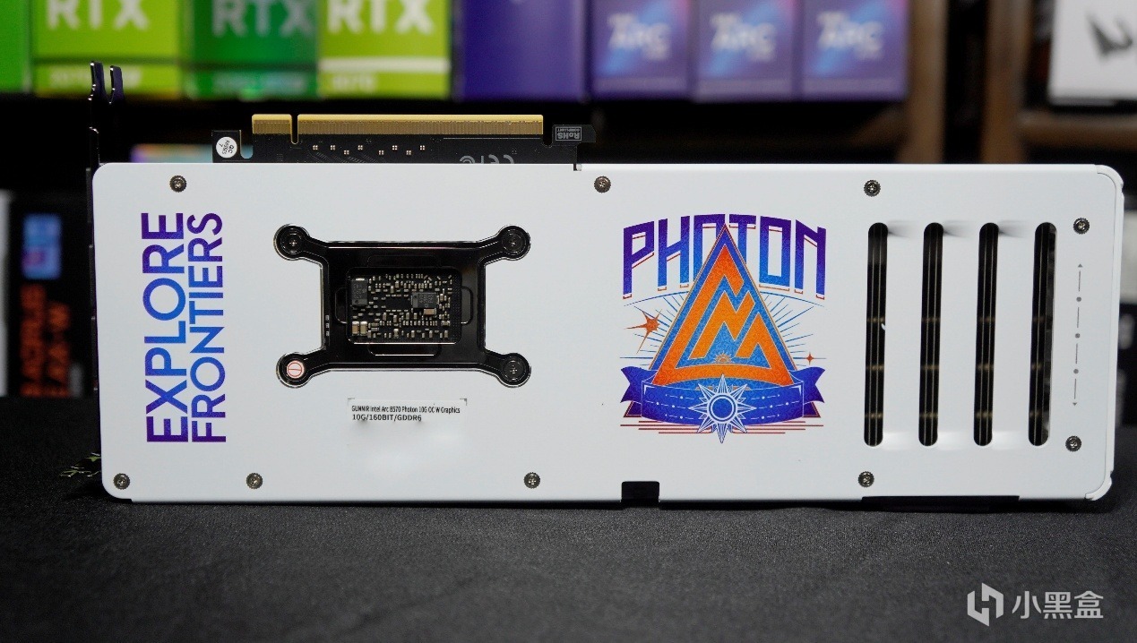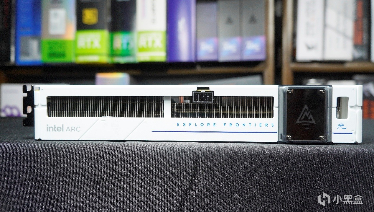 透过蓝戟B570 Photon 10GB顶部,我们可以看到散热器内部的散热鳍片,开孔面积不算小。左下角位置印有intel ARC字样,字体应该采用经典蓝色配色,右侧位置则是印有“EXPLORE FRONTIERS”和“光”字样。