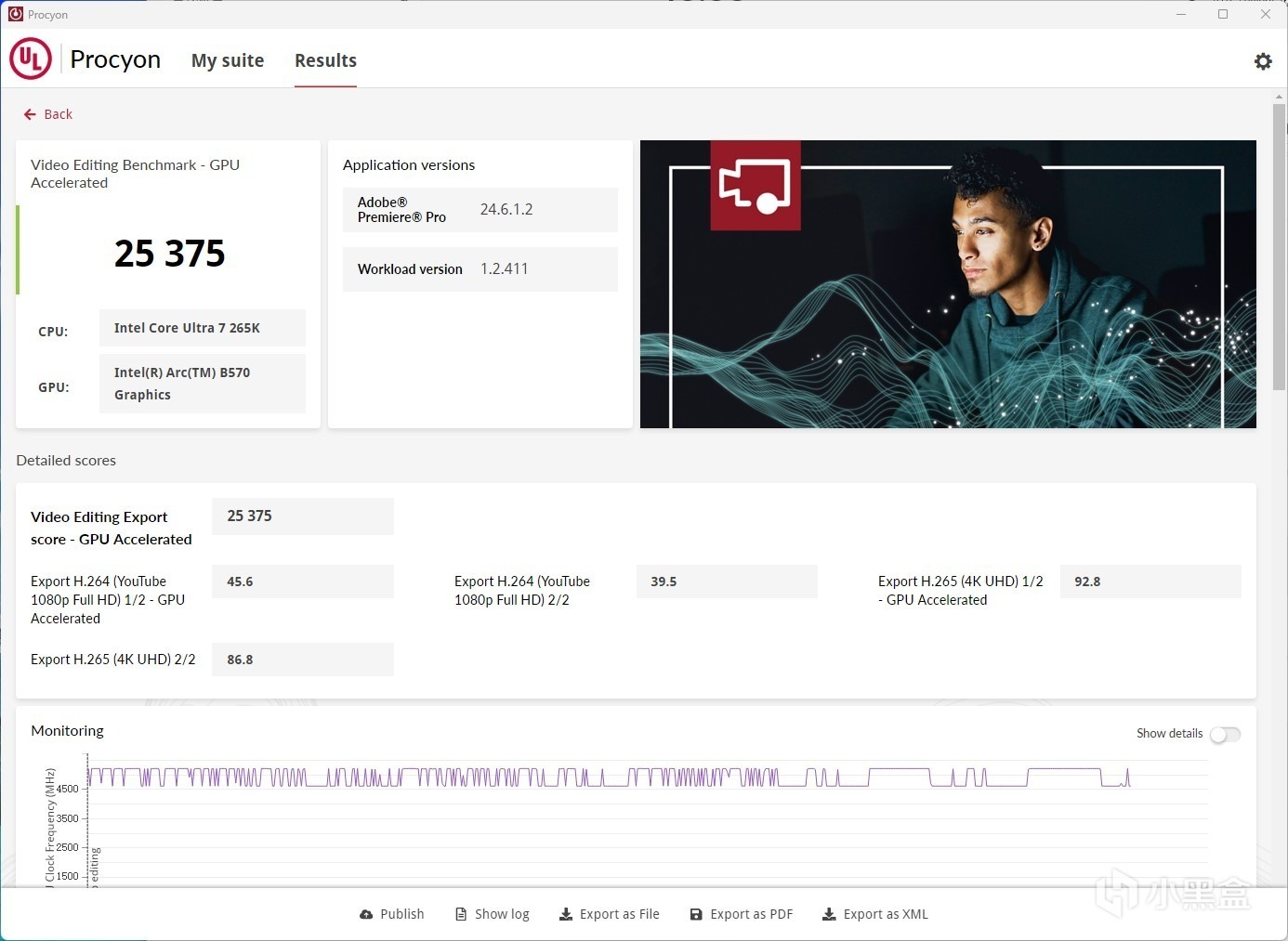 UL Procyon测试的内容比较多,整体花费的时间也最长。先来看看开启GPU加速下的Video Editing Benchmark测试结果,蓝戟B570 Photon 10GB得分为25375,其中Export H.264 (YouTube1080p Full HD) 1/2 (GPU Accelerated)得分为45.6,Export H.265 (4K UHD) 1/2(GPU Accelerated)得分为92.8。