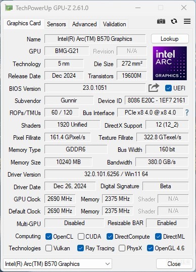 接下来再来看看蓝戟B570 Photo 10GB的硬件参数。蓝戟B570 Photon 10GB配备18个Xe2核心、18个光追单元、144个XMX引擎,INT8算力性能203 TOPS。蓝戟B570 Photo 10GB搭载的是160-bit位宽的GDDR6显存,显存带宽为380GB/s,支持Resizable BAR、支持光追。蓝戟B570 Photo 10GB默认基础频率为2690MHz,高于公版的2500MHz,功耗也提升到了186W。