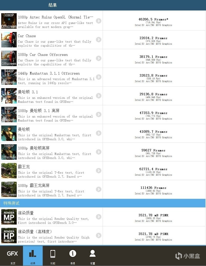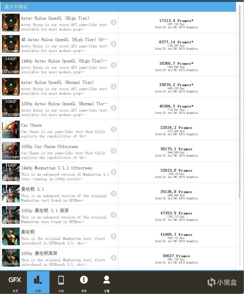 GFXBench常见用于移动平台,比如手机、平板电脑等等设备的图形性能测试,不过它也支持PC端图形性能测试。我这里选择了OpenGL和DirectX 12分别进行测试。OpenGL下选择了高水平测试和特殊测试,测试的项目很多,可以自行参考测试结果。