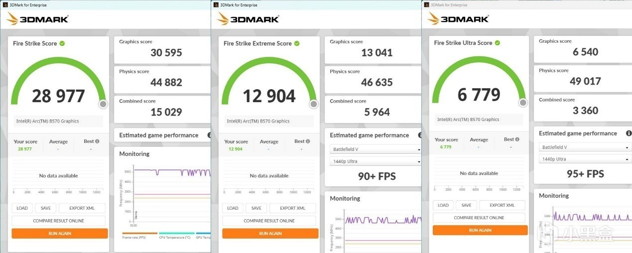 蓝戟B570 Photo 10GB在Fire Strike下的分数为28977,显卡得分为30595;在Fire Strike Extreme下的分数为12904,显卡得分为13041;在Fire Strike Ultra下的分数为6779,显卡得分为6540。