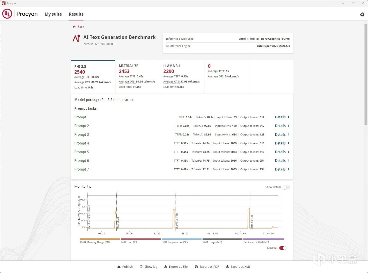 在AI Text Generation Benchmark功能下,蓝戟B570 Photo 10GB在PHI 3.5下的得分为2540,Average TTFT为0.32s,Average OTS为80.71 tokens/s;在MISTRAL 7B下的得分为2453,Average TTFT为0.45s,Average OTS为 59.94 tokens/s;在LLAMA 3.1下的得分为2290,Average TTFT为 0.45s,Average OTS为 57.95 tokens/s。