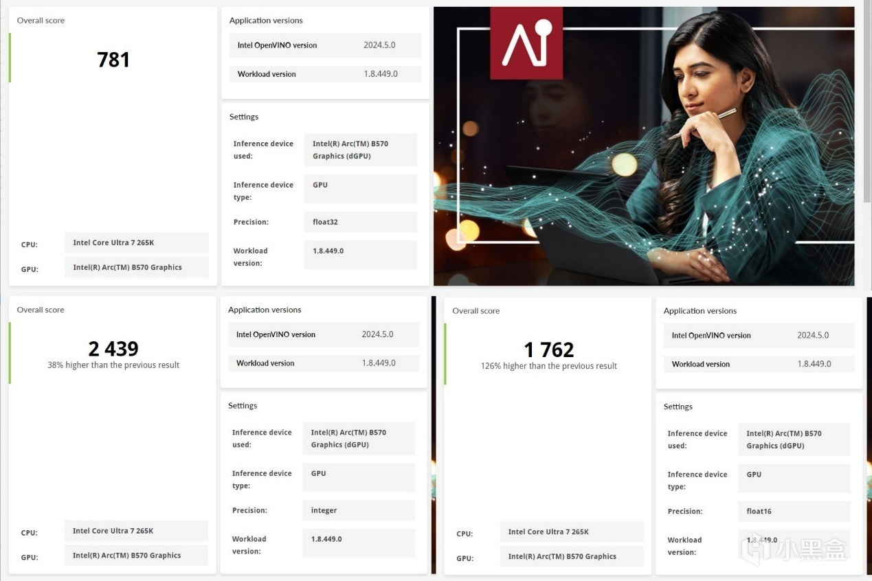 在Al Computer Vision Benchmark的Intel OpenVINO功能下,蓝戟B570 Photon 10GB在GPU Float 32下的得分为781,在integer下的得分为2439,在Float 16下的得分为1762。
