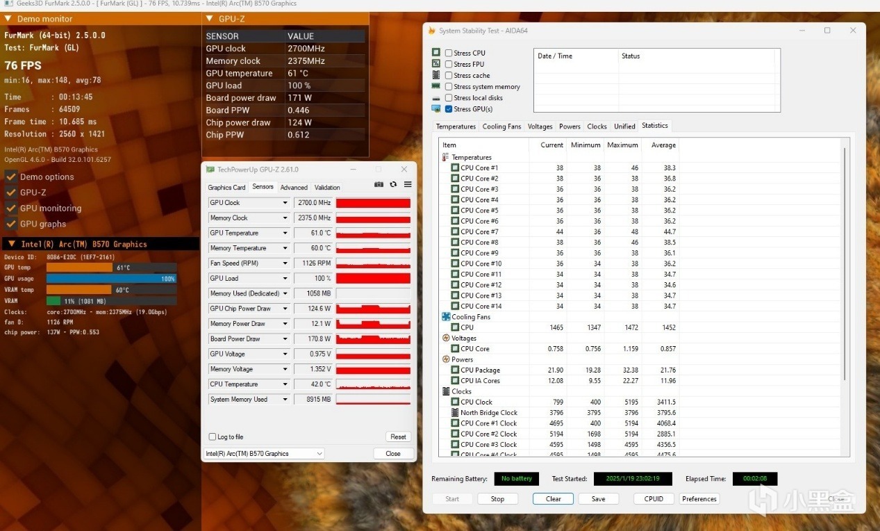 但如果是搭配AIDA64和Furmark 2.3.0对蓝戟B570 Photo 10GB进行双烤,此过程中蓝戟B570 Photo 10GB功率会有所降低,来到了170瓦左右,而GPU Clock则是提升到了2700MHz,蓝戟B570 Photon 10GB在散热方面的表现仍旧比较稳定。
