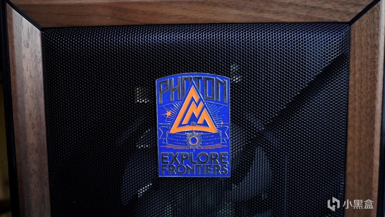 抽出包装后,第一眼看到的就是蓝戟全新磁吸式金属铭牌,吸力比较大,可以吸附在机箱或是冰箱上。这个金属铭牌绘制的图案包含蓝戟GUNNIR品牌 logo、太阳图案,以及“Photon”、“EXPLORE FRONTIERS”字样,与蓝戟B570 Photon 10GB所在的Photon(光系列)保持了一致。