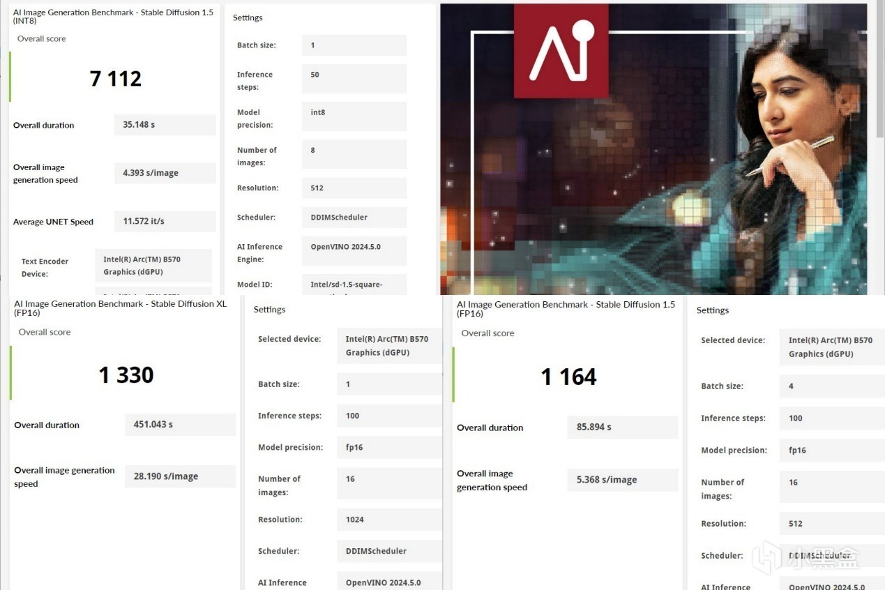 在Al lmage Generation Benchmark -Stable Diffusion功能测试中,蓝戟B570 Photon 10GB在Stable Diffusion 1.5(INT8)下的得分为7112,图片生成速度为4.393 s/image,平均UNET速度为11.572 it/s;在Stable Diffusion XL(FP16)下的得分为1330,图片生成速度为28.190 s/image;在Stable Diffusion 1.5(FP16)下的得分为1164,图片生成速度为5.368 s/image。