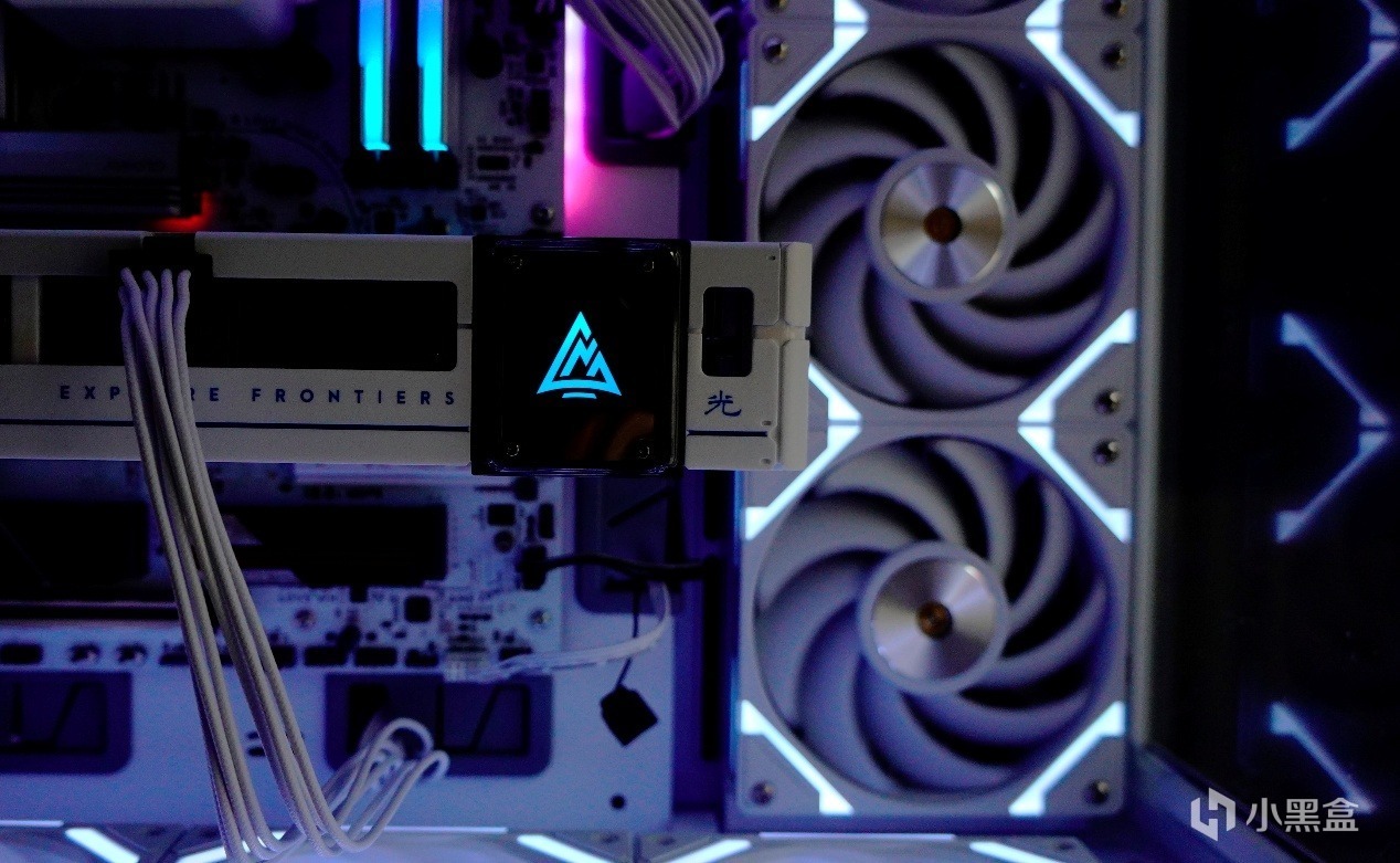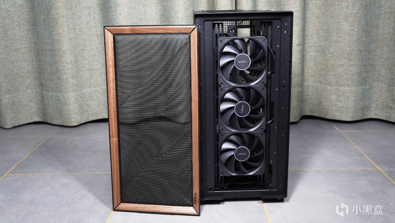 机箱是安钛克FLUX,设计上的亮点一是前面板四周加入了木材设计;二是自带5把无光风扇,即前置3把12厘米风扇、后置1把14厘米风扇以及底部1把12厘米反向风扇,基本不用再去另外购买风扇安装,搭配自行安装的1把反向风扇和冷排自带的3把风扇,整个机箱内部是9把风扇,散热性能方面更有保证,也不用担心SSD、内存条超频后的散热问题。