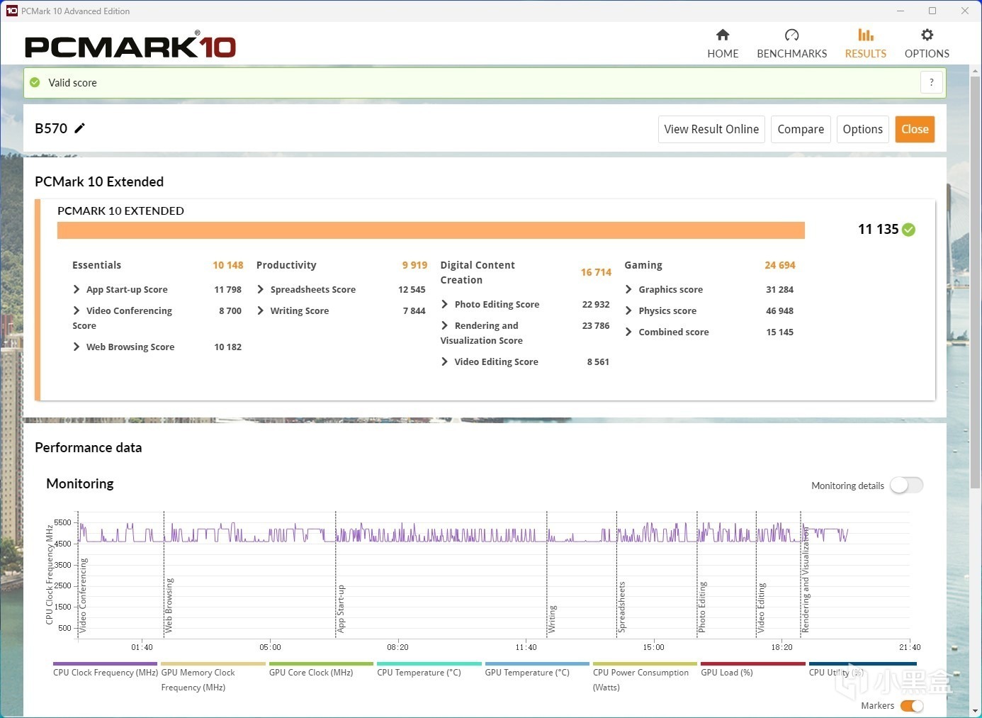 整机性能方面,我这里搭配PCAMARK10 Extended进行了测试。蓝戟B570 Photon 10GB在PCMark 10 Extended下的得分为11135,其中游戏得分为24694,显卡得分为31284。