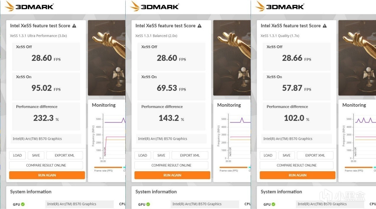 先来看看3DMARK软件下的测试结果。蓝戟B570 Photon 10GB在3DMARK Xess 1.3.1 Ultra Performance (3.0x)下的测试结果如下, XeSS Off对应的结果为28.60 FPS,Xess Onf对应的结果为95.02 FPS;在Xess 1.3.1 Balanced (2.0x)模式下, XeSS Off对应的结果为28.60 FPS, XeSS On对应的结果为69.53FPS;在Xess 1.3.1 Quality (1.7x)下,XeSS Off对应的结果为28.66 FPS, XeSS On对应的结果为57.87FPS 。