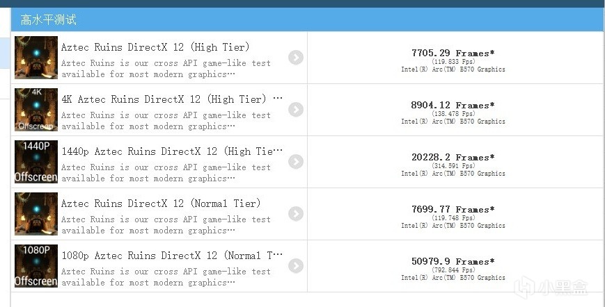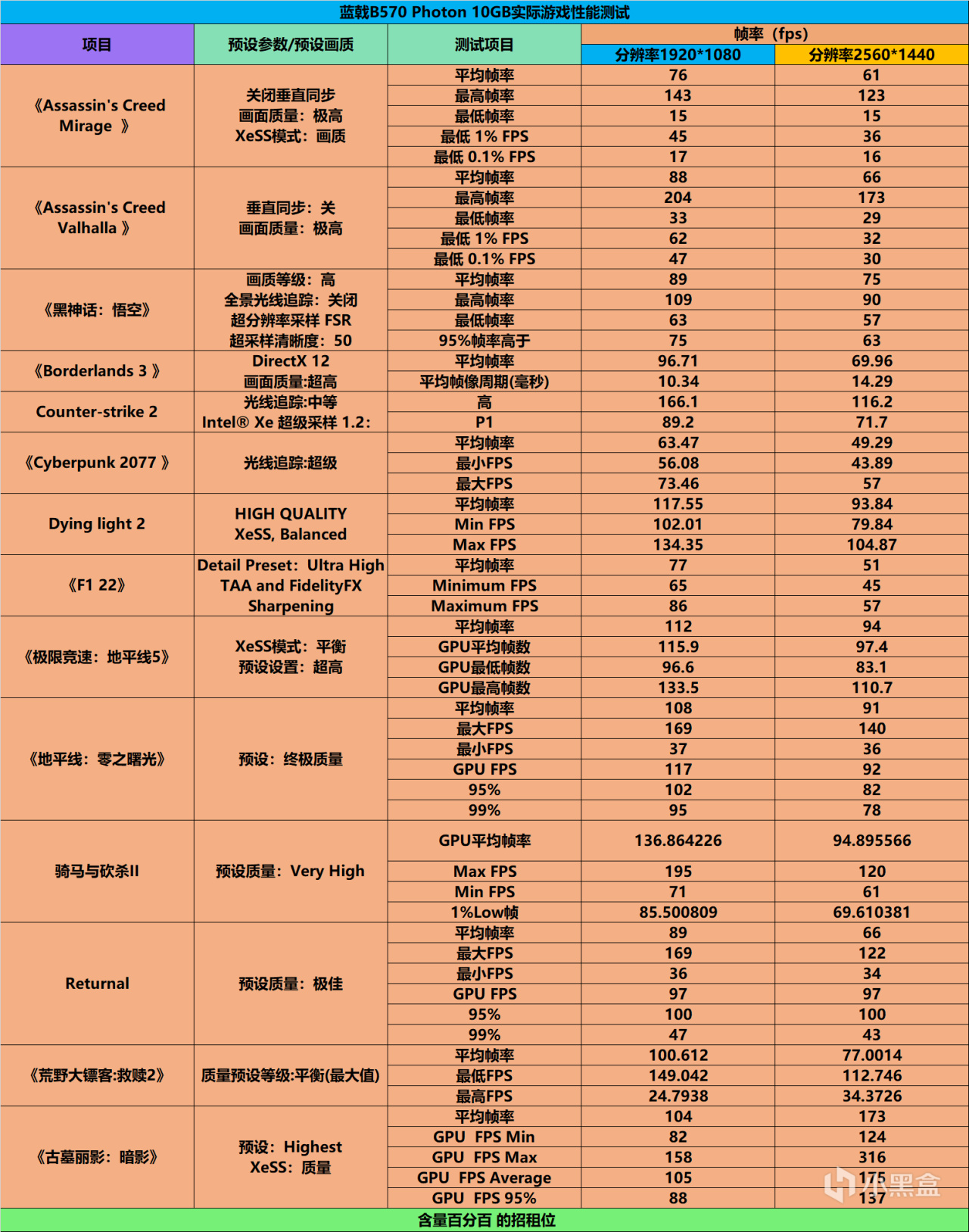 游戏测试的部分,我这里主要选择了一些内置Benchmark的游戏,分别在1080P和2K分辨率进行测试,部分游戏有支持XeSS,但暂时没有支持XeSS2的游戏,目前市面上已经支持XeSS 2的游戏有《F1 24》。相较于XeSS,这次的XeSS 2不仅仅是对Super Resolution进行了优化提升,还引入了 Frame Generation(帧生成)和 Low Latency(低延迟)两大新功能。另外Xe2架构使用了新一代的RTU光线追踪单元,不仅是单个单元的吞吐量翻倍,而且第二代XMX引擎还可以实现AI补帧,从而可以进一步提升画质。就实际测试结果而言,2K分辨率+高画质下,蓝戟B570 Photon 10GB基本能够实现大多数游戏的流畅运行,另外B570 显卡已经支持最新的DirectX 12 Ultimate,基本不用担心游戏兼容性的问题。