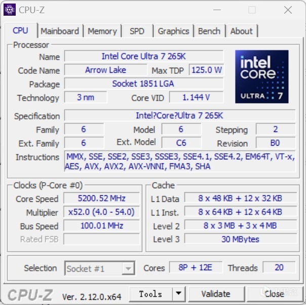 CPU是酷睿Ultra 7 265K,它与i7-14700K(F)设计保持一致,采用了8个性能核+12个能效核设计,区别在于酷睿Ultra 7 265K不支持超线程,所以线程数是20,基础功耗依旧为125W,最大睿频功耗为250W。性能核和能效核的最高睿频分别是5.5GHz和4.6GHz,性能核比i7-14700K(F)下降了0.1GHz,能效核则是提升了0.3 GHz。此外酷睿Ultra 7 265K二级缓存和三级缓存分别是36MB和30MB, 二级缓存相比于i7-14700K(F)提升了8MB,三级缓存则是降低了3MB。