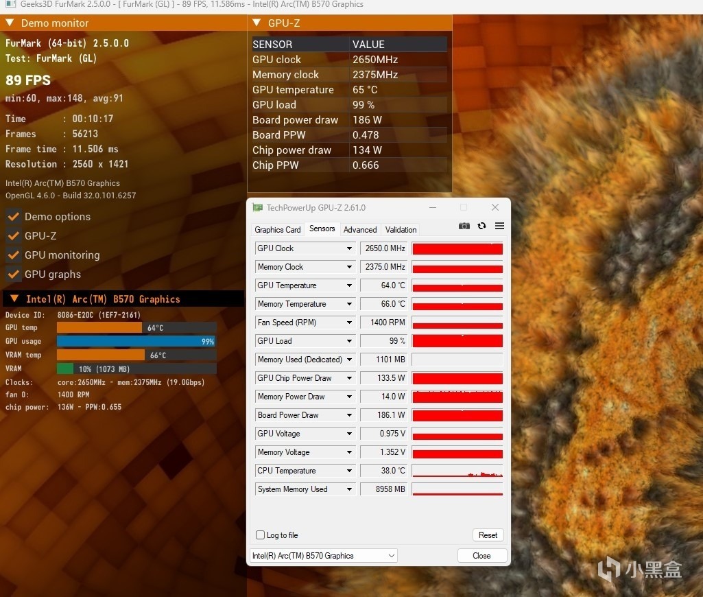 如果是仅仅搭配Furmark 2.3.0在2K分辨率进行压力测试,那么GPU clock对应的频率是额定的2650MHz,功率也达到了最大的186 W。在十分钟的压力测试过程中,频率一直很稳定,没有什么太大的波动,此时温度也只是到了64摄氏度(暖气房间24摄氏度),散热性能表现良好。