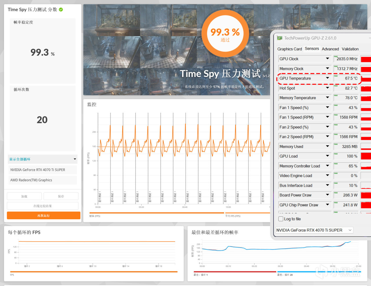 ▼3Dmark的压力测试,循环20次,最高温度67.5℃,同样是没超过70℃。