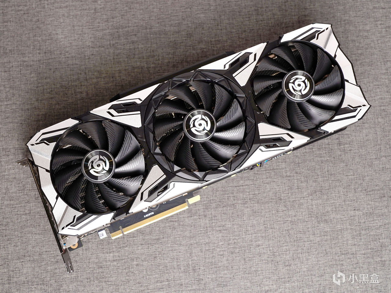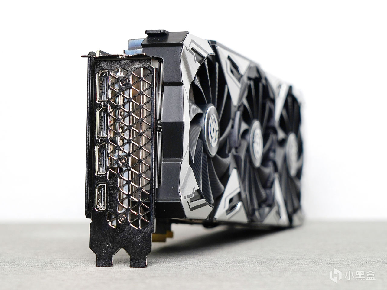 ▼显卡尺寸为334mm*131mm*64mm,散热体系为三风扇+加厚加高鳍片,导风罩采用了类似大块银鳞合金甲片的设计,极具装甲风格,棱角分明,相当硬朗。
