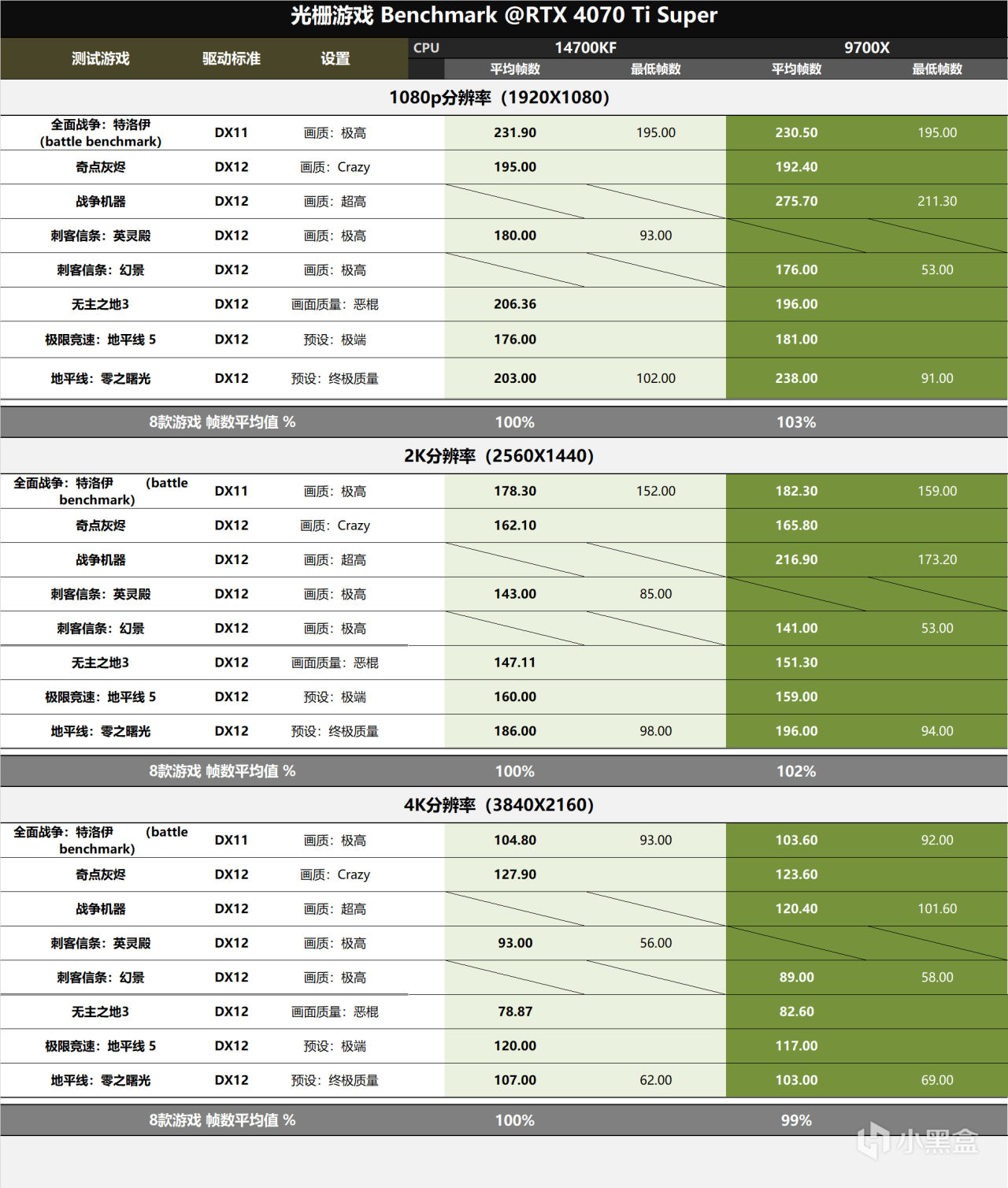 由于之前还用14700KF测试过RTX4070Ti S,所以下面的游戏测试有2个平台的成绩,也起到对比的作用。